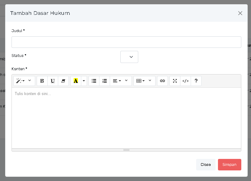 - Klik tombol "+ Tambah Dasar Hukum" berwarna merah di pojok kanan atas