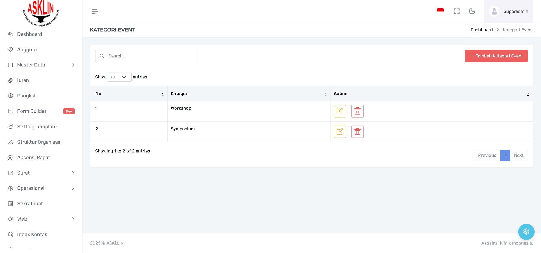 Setelah konfirmasi, kategori tersebut akan dihapus dari daftar. Catatan: Penghapusan mungkin diblokir jika kategori tersebut sedang digunakan oleh data event yang sudah dicatat.