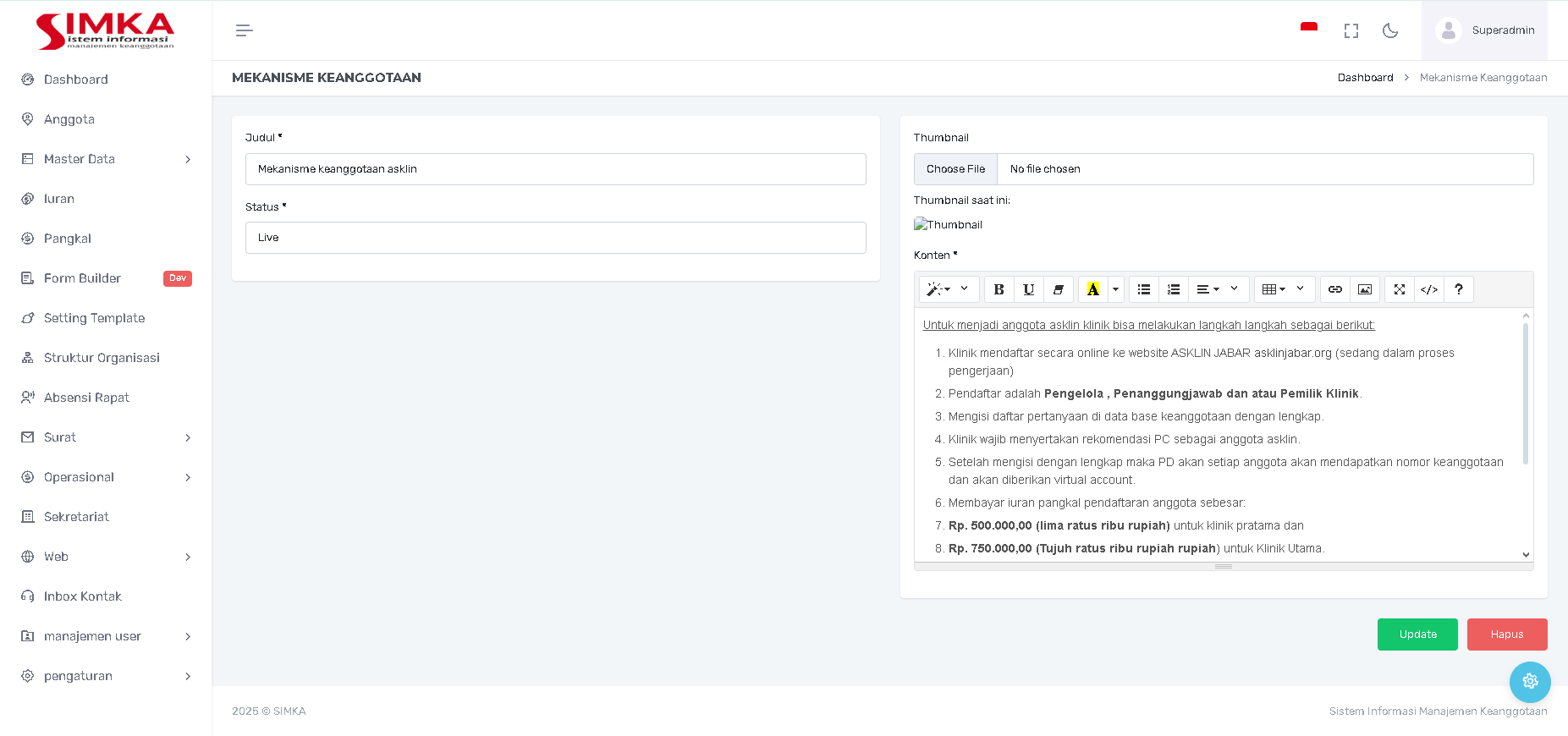 Halaman ini berfungsi untuk mengelola satu halaman statis yang menjelaskan prosedur pendaftaran, persyaratan, dan detail keanggotaan.