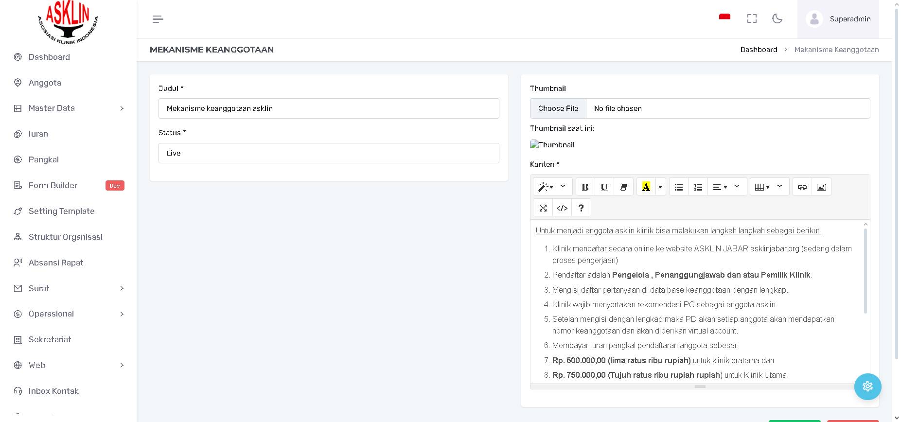 Halaman ini berfungsi untuk mengelola satu halaman statis yang menjelaskan prosedur pendaftaran, persyaratan, dan detail keanggotaan.