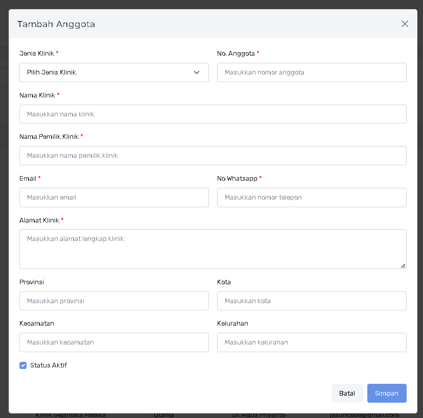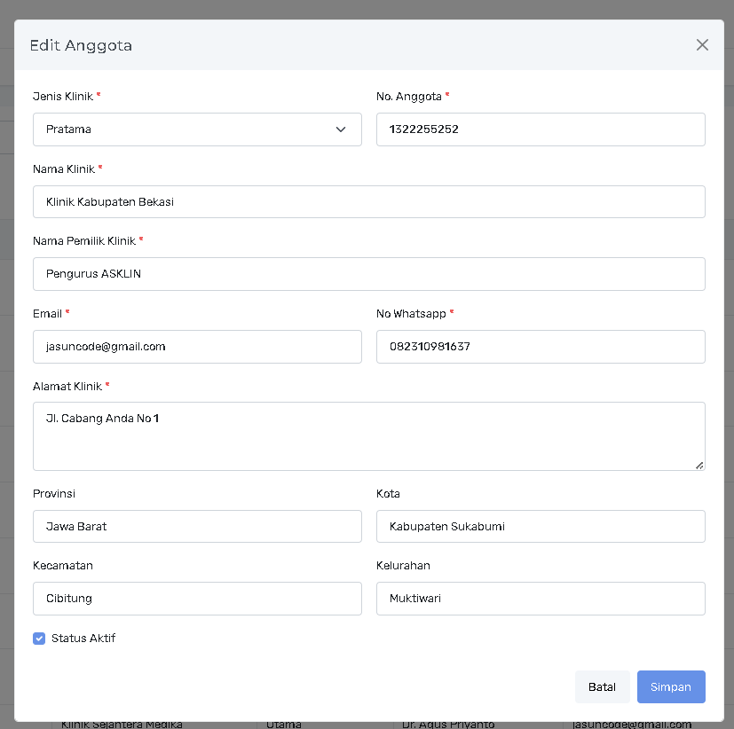 Catatan: Formulir "Edit Anggota" memiliki struktur yang sama persis dengan formulir "Tambah Anggota". Semua field dapat diubah, termasuk data seperti Jenis Klinik, Nama Klinik, Email, dan detail Alamat.