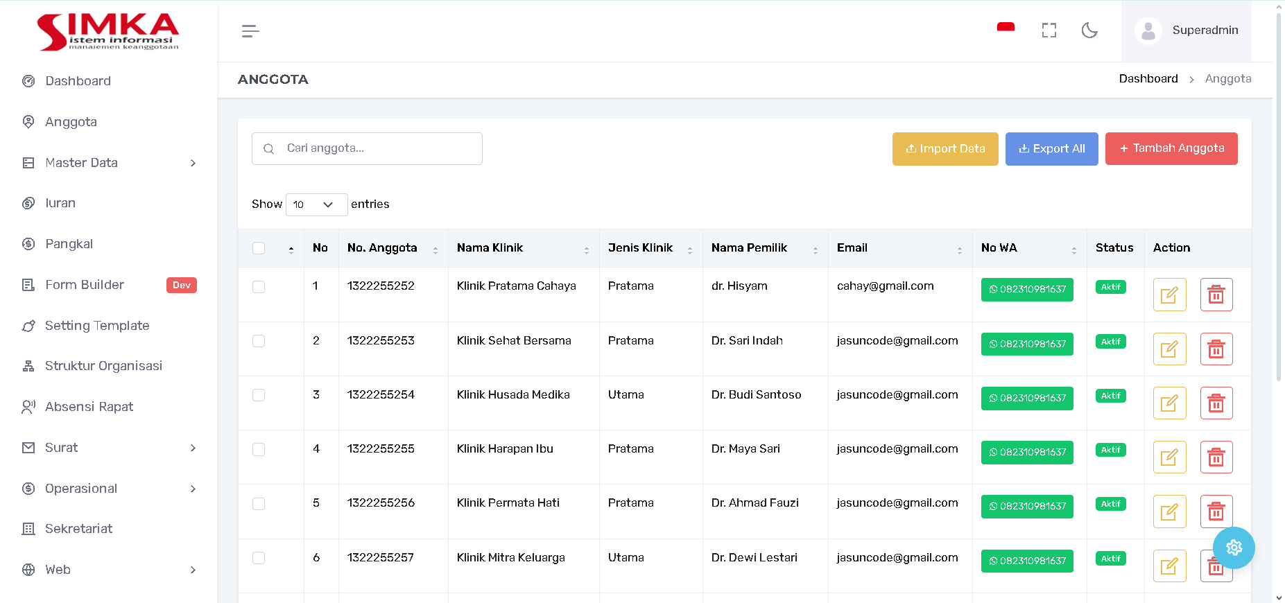 Modul Anggota berfungsi untuk mengelola data keanggotaan klinik yang terdaftar dalam , mulai dari melihat daftar anggota, menambah, mengubah, hingga mengimpor data anggota secara massal.