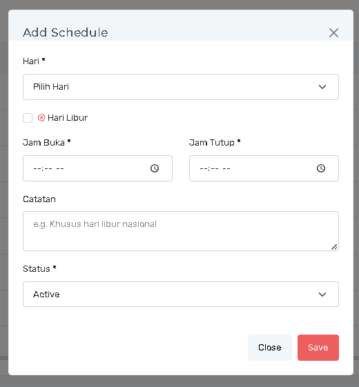 Modal ini digunakan untuk menentukan jam buka/tutup untuk hari tertentu atau memodifikasi jadwal yang sudah ada.