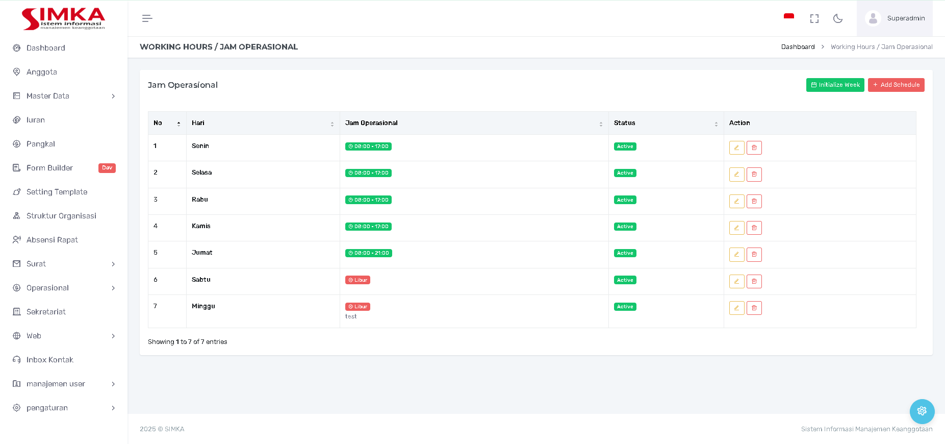 Update (Edit): Klik ikon Pensil ✏️ pada kolom Action untuk mengubah jam operasional hari tertentu.