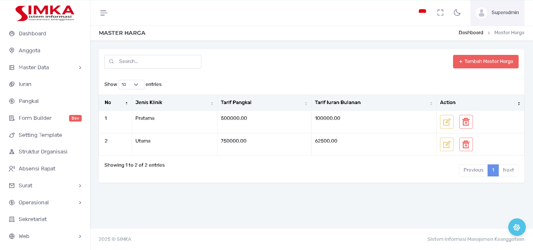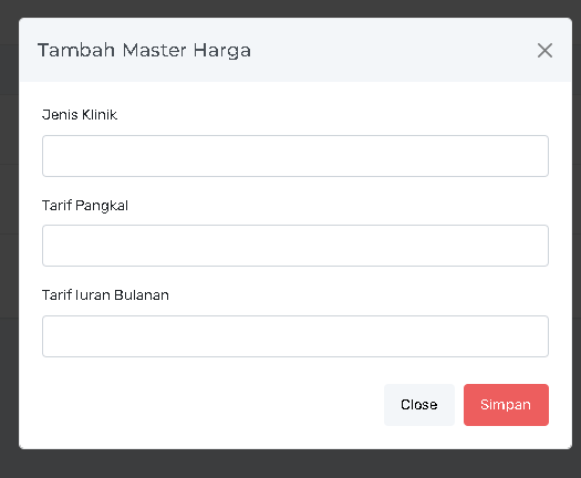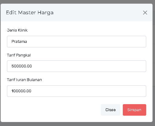 Modul Master Harga berfungsi untuk mengelola tarif biaya keanggotaan yang berlaku bagi klinik, yang terdiri dari Tarif Pangkal dan Tarif Iuran Bulanan. Harga ini dibedakan berdasarkan Jenis Klinik (Pratama atau Utama).