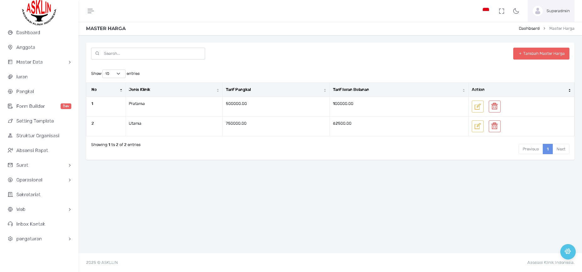 Modul Master Harga berfungsi untuk mengelola tarif biaya keanggotaan yang berlaku bagi klinik, yang terdiri dari Tarif Pangkal dan Tarif Iuran Bulanan. Harga ini dibedakan berdasarkan Jenis Klinik (Pratama atau Utama).