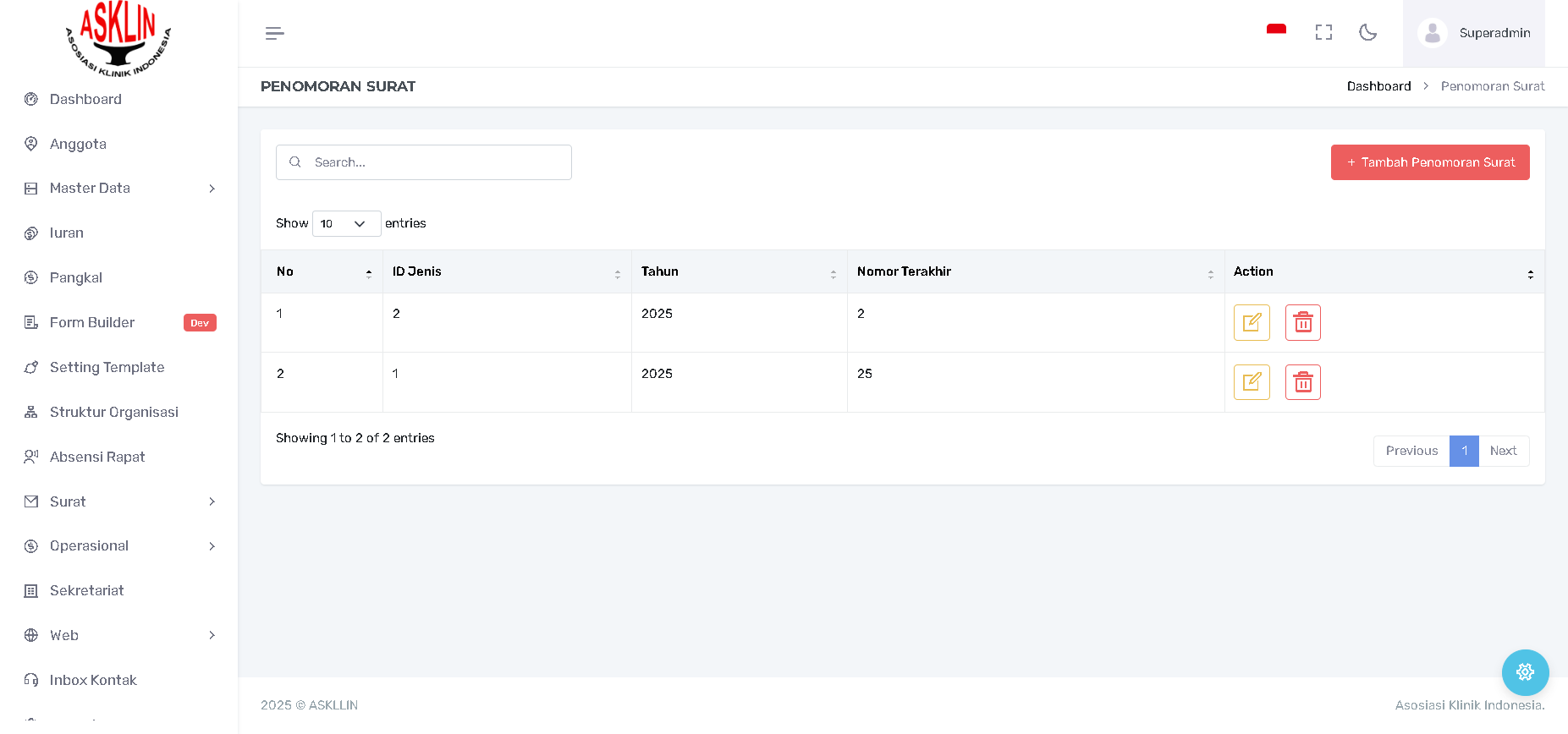Action: Tombol Edit dan Delete untuk mengelola data setting penomoran.