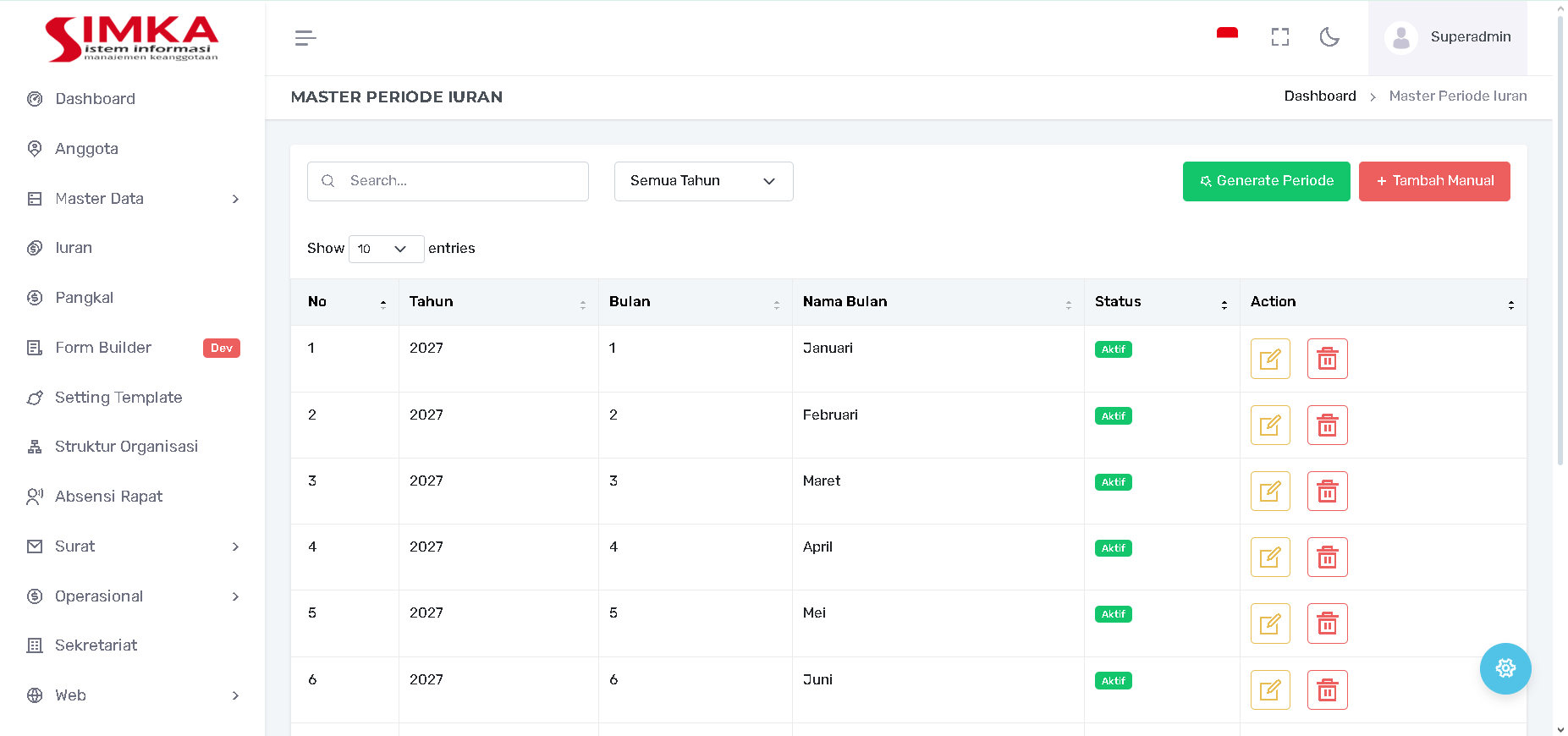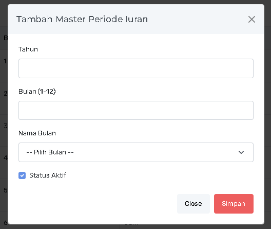 Modul Master Periode Iuran berfungsi untuk membuat dan mengelola daftar periode waktu (bulan dan tahun) yang akan digunakan untuk penagihan iuran keanggotaan. Modul ini menyediakan dua cara pembuatan periode: Generate Otomatis untuk satu tahun penuh, atau Tambah Manual untuk periode spesifik.