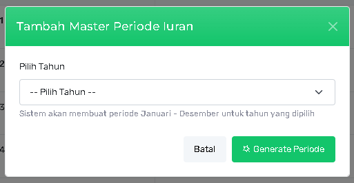 Fitur ini digunakan untuk membuat 12 periode iuran sekaligus (Januari hingga Desember) untuk satu tahun yang dipilih.