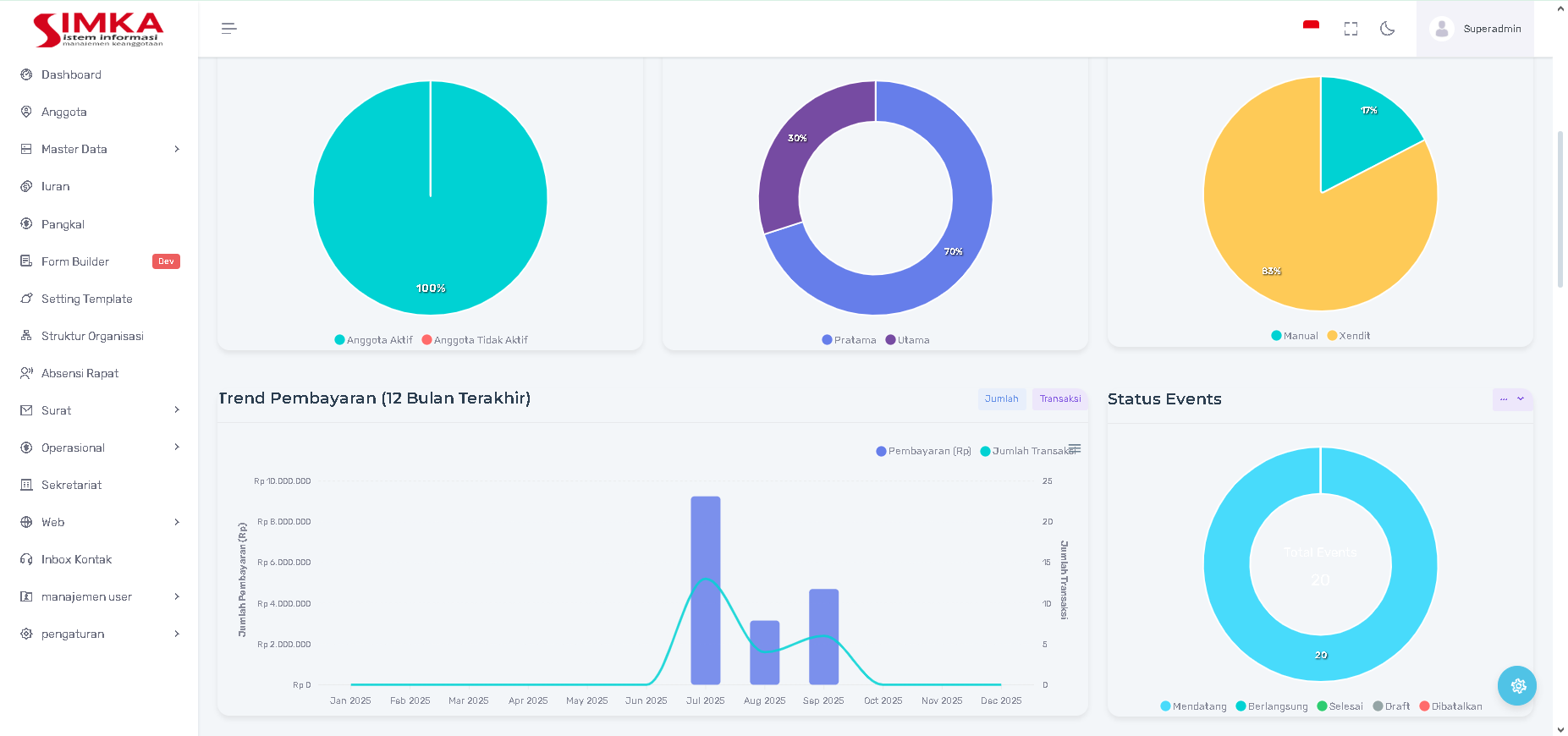 | Status Anggota | Diagram lingkaran yang menunjukkan persentase Anggota Aktif vs. Anggota Tidak Aktif. | Indikator utama kesehatan organisasi. |