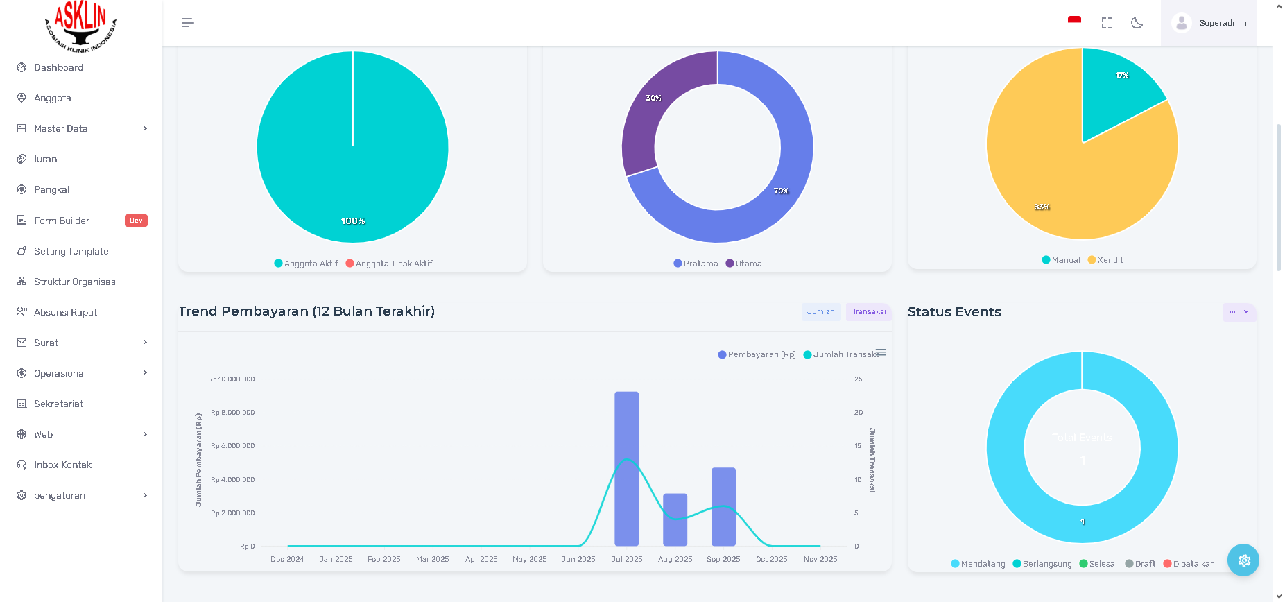 | Status Anggota | Diagram lingkaran yang menunjukkan persentase Anggota Aktif vs. Anggota Tidak Aktif. | Indikator utama kesehatan organisasi. |