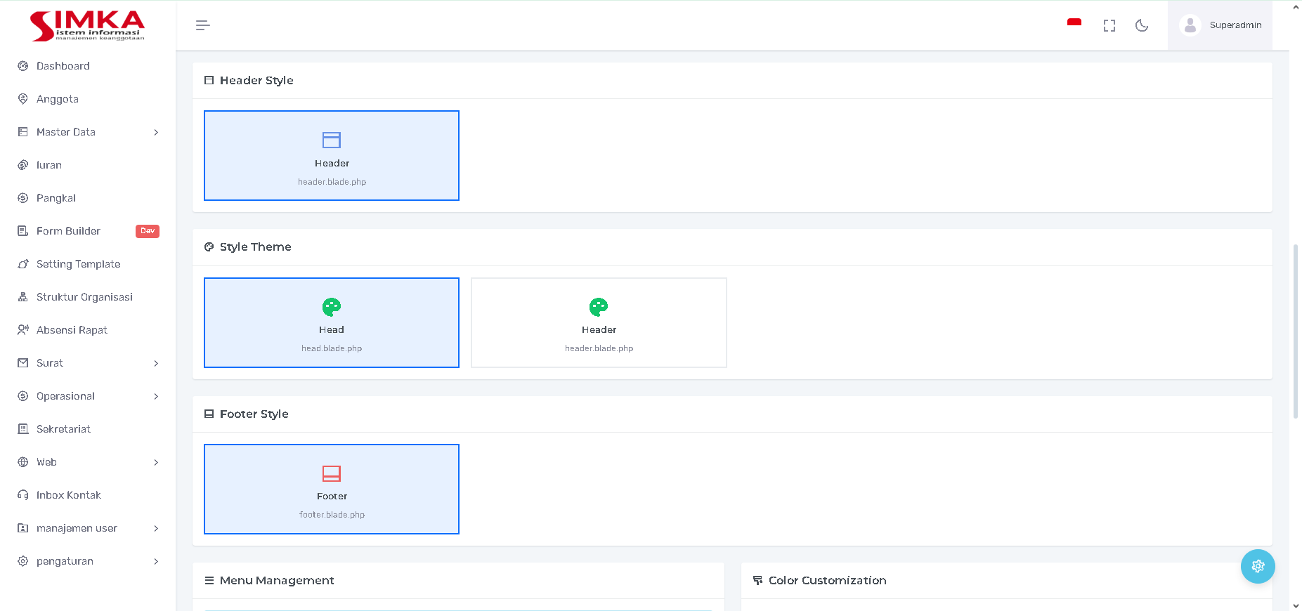Halaman Layout Settings (Pengaturan Tata Letak) berfungsi sebagai pusat kontrol untuk mengelola tampilan elemen struktural website seperti Logo, Header, Footer, serta menu navigasi dan skema warna.