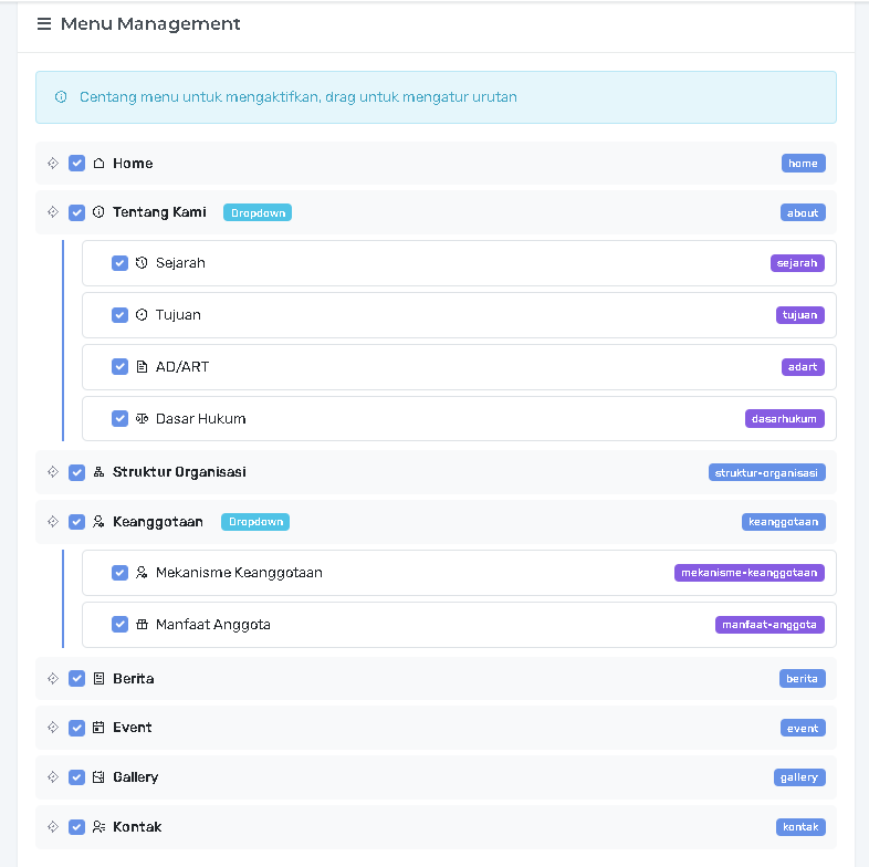 Mengatur Urutan: Anda dapat menggunakan fitur drag dan drop (geser dan lepas) untuk mengatur urutan menu.
