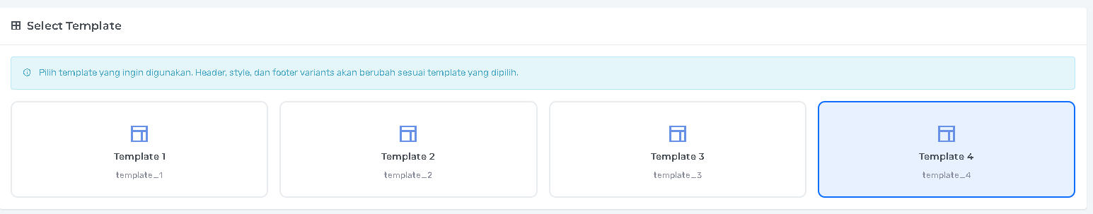 Perhatian Penting: Pemilihan template di sini harus sesuai dengan template yang Anda aktifkan di halaman Template Website sebelumnya, untuk memastikan Header, Style, dan Footer yang dipilih bekerja dengan benar. Header, style, dan font varian akan berubah sesuai template yang dipilih.