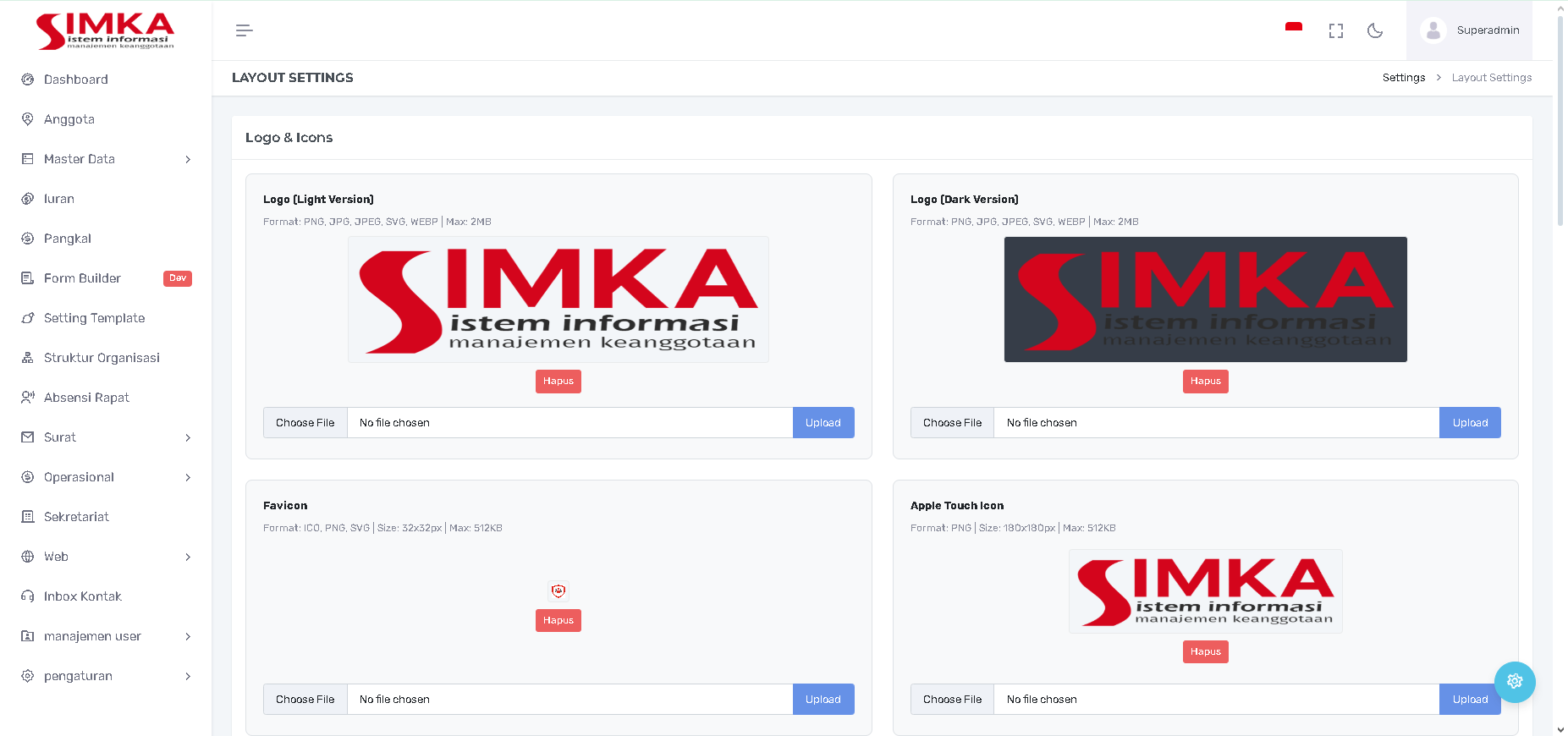 | Logo (Light Version) | Logo utama untuk background terang. | PNG, JPG/JPEG, SVG, WEBP (Max 2MB). |