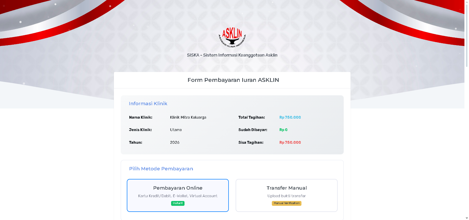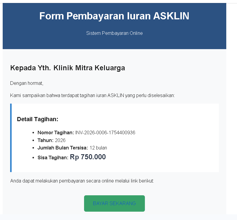 Info Tarif Iuran: Sistem akan menampilkan referensi tarif iuran yang diambil dari database Master Harga. Contoh: Klinik Pratama (Rp 1.200.000/tahun), Klinik Utama (Rp 750.000/tahun).
