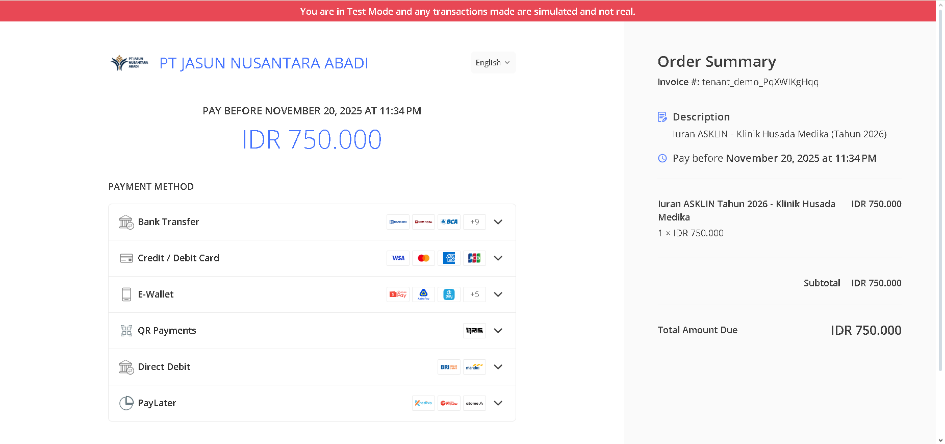 Catatan: Karena sistem berada dalam Test Mode, semua metode pembayaran (Bank Transfer, Kartu Kredit/Debit, E-Wallet, QRIS, dll.) ditampilkan. Dalam mode Production, branch SIMKA mungkin hanya mengaktifkan metode tertentu (seperti QR Payments/QRIS) karena pertimbangan biaya transaksi yang lebih rendah.