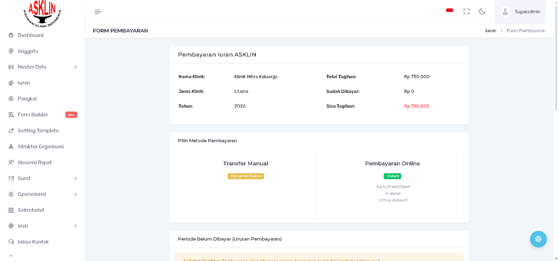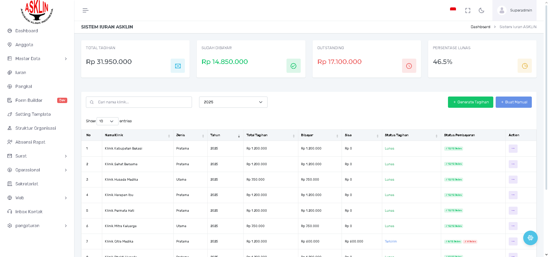 Modul Sistem Iuran Anggota berfungsi untuk mengelola seluruh proses penagihan iuran keanggotaan. Fitur utama modul ini adalah membuat tagihan secara massal (tahunan) atau spesifik (manual) berdasarkan Jenis Klinik dan status aktif anggota.