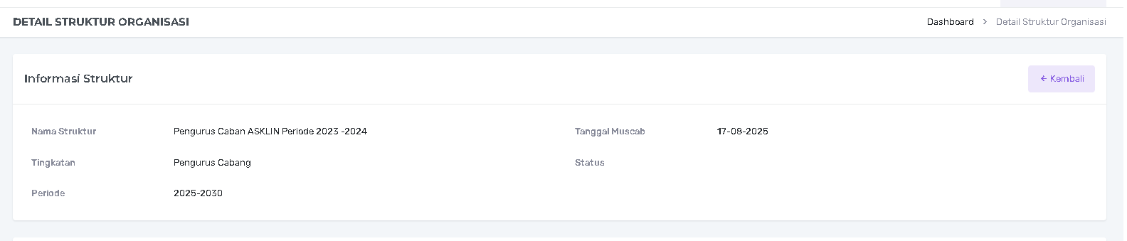 Halaman Detail Struktur Organisasi diakses dengan mengklik tombol "Detail" pada baris periode kepengurusan yang diinginkan. Halaman ini berfungsi untuk menyusun daftar nama-nama pengurus berdasarkan jabatan (Pimpinan, Bendahara, Sekretariat, dan Bidang).
