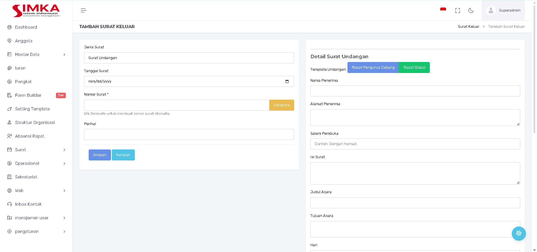 Tampilan: Sisi kanan akan menampilkan form isian khusus untuk Surat Undangan