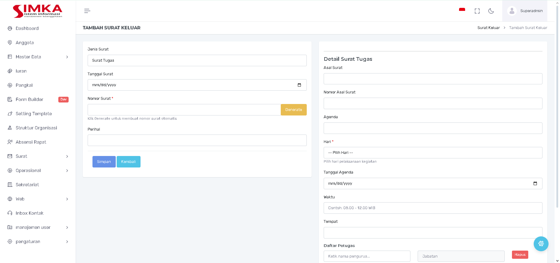Tampilan: Sisi kanan akan menampilkan form isian khusus untuk Surat Tugas