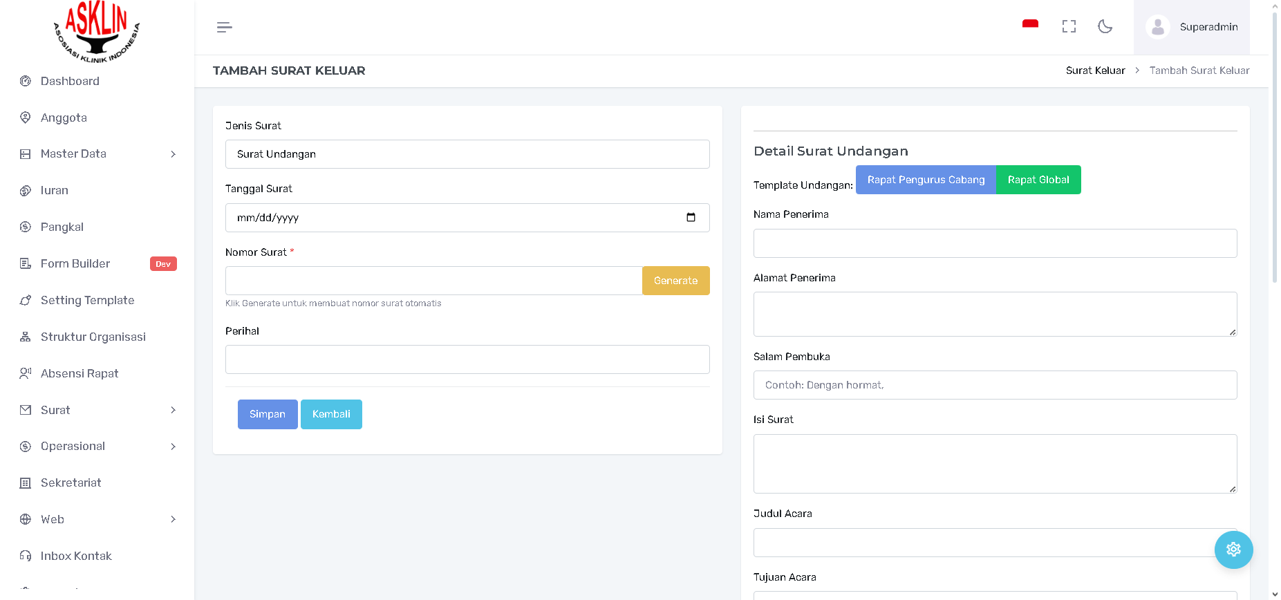 Tampilan: Sisi kanan akan menampilkan form isian khusus untuk Surat Undangan