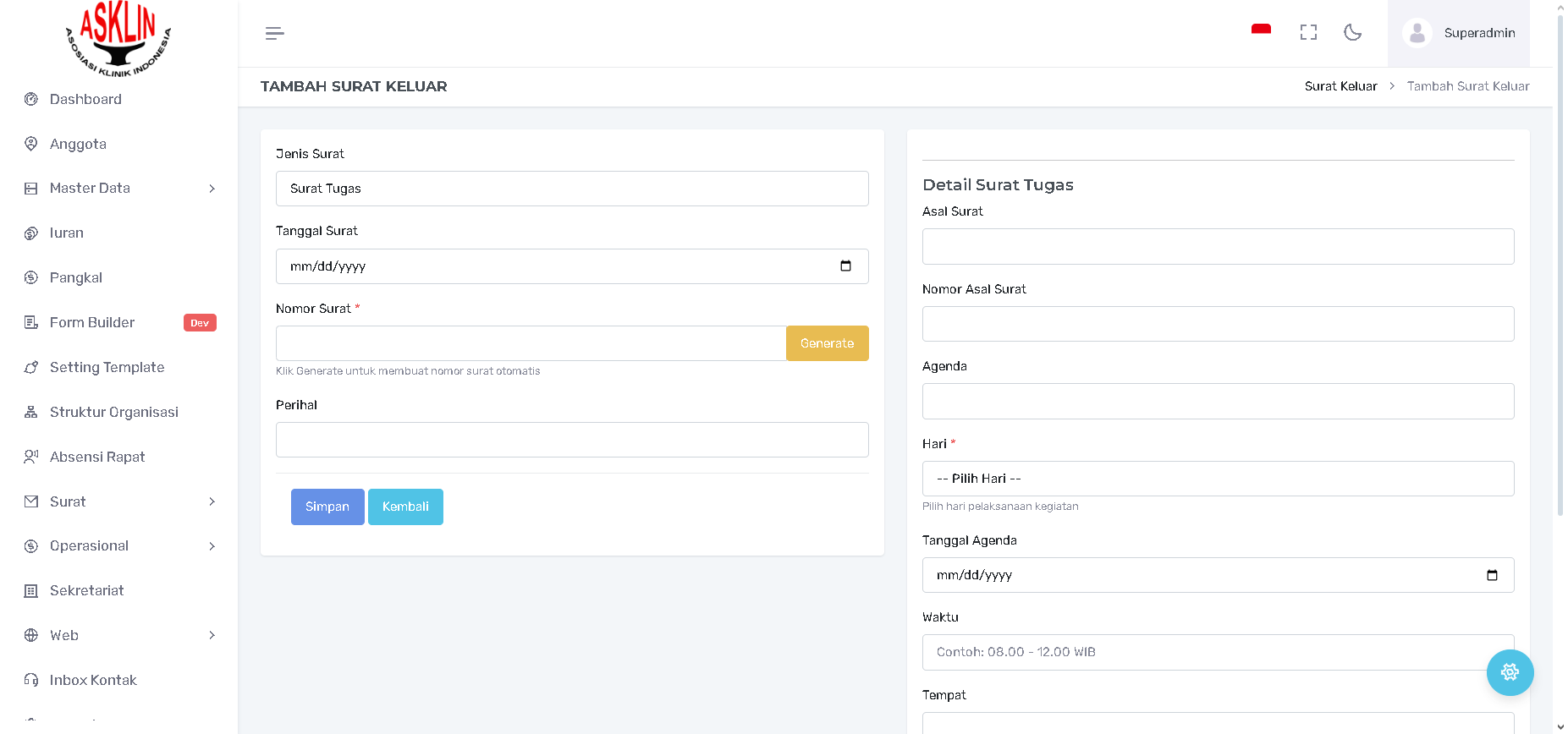 Tampilan: Sisi kanan akan menampilkan form isian khusus untuk Surat Tugas